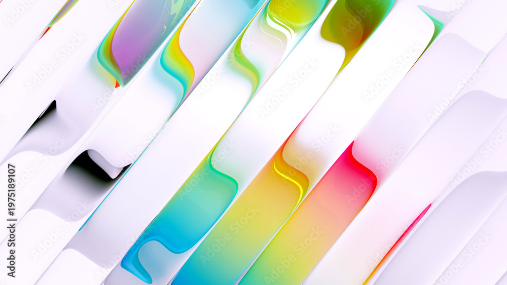 3d render of abstract art of a surreal 3d background based on liquid glass sticks in rotation movement in curved wavy, smooth and soft organic lines forms in white and color gradient parts #1975189107
