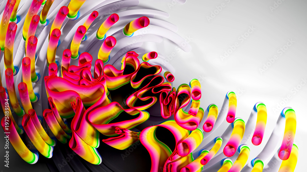 3d render of abstract art of surreal circles, ropes on a curve, wavy organic lines, forms in a deformation transformation process in purple and white, and blue gradient color #1975189194