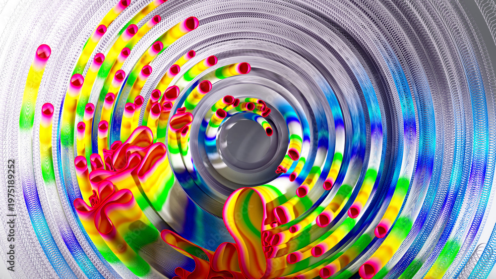 3d render of abstract art of surreal circles, ropes on a curve, wavy organic lines, forms in a deformation transformation process in purple and white, and blue gradient color #1975189252