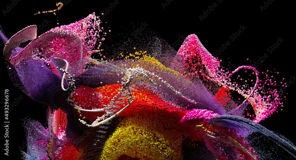3d render of abstract art with surreal explosion powder foam cloud based on small mixed balls spheres or bubbles particles in yellow pink and purple color in plastic and metal material on black #493296678