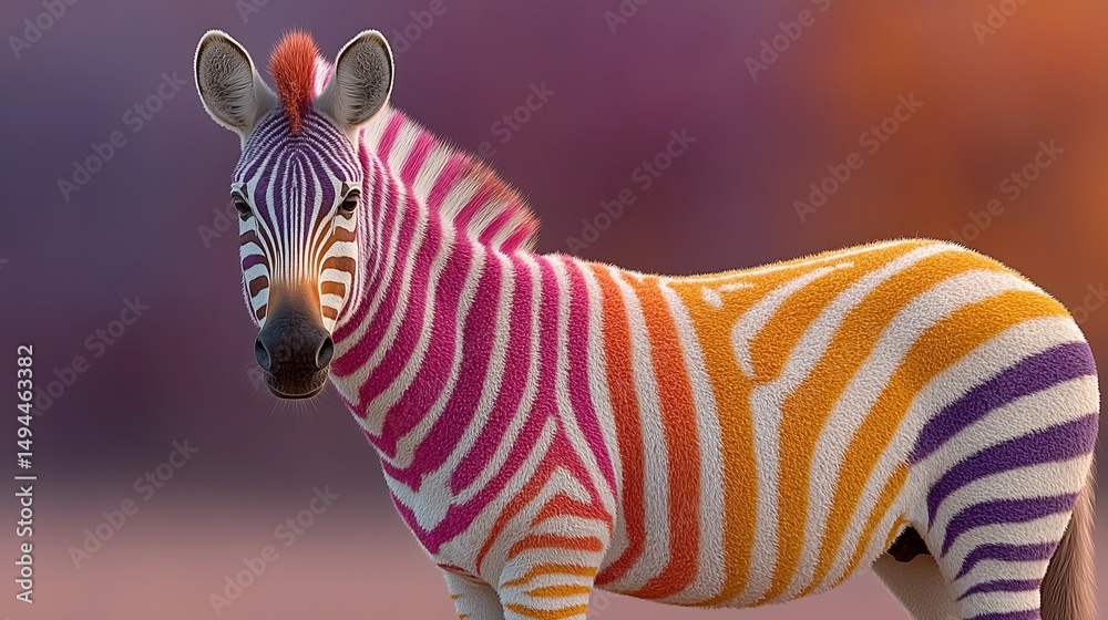 3D rendering of a zebra with multi-colored stripes. #1494463382