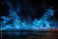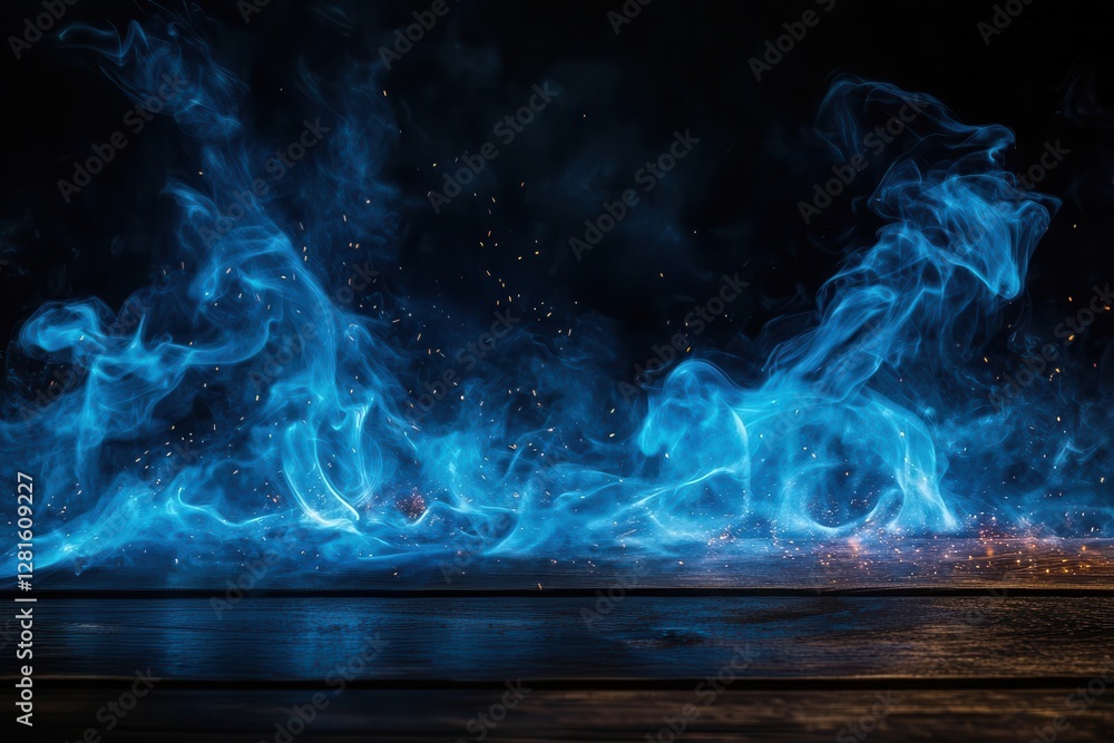 dark wooden table with ethereal blue flames dancing along edges dramatic smoke tendrils rising sparks floating against black background #1281609227