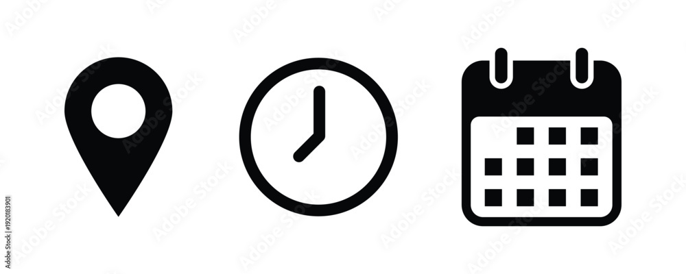date time location notification icon set. Address, time, calendar bell notification icons collection. Clock, Address location and date Calendar symbol #1920183901