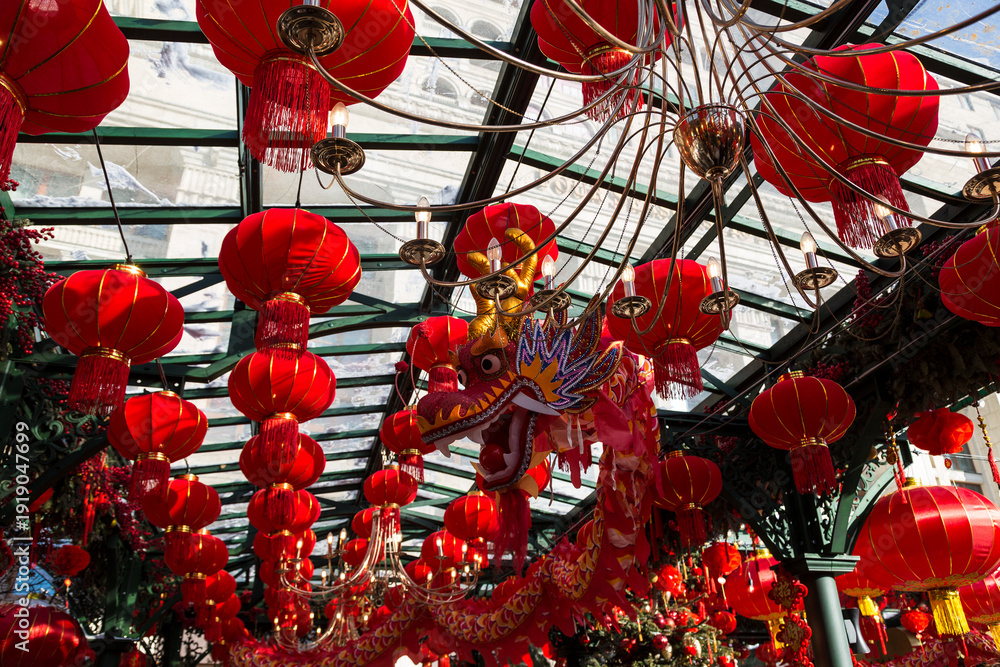 Decorations for the Chinese New Year celebration at Manezhnaya Square in Moscow, Russia #1919047699