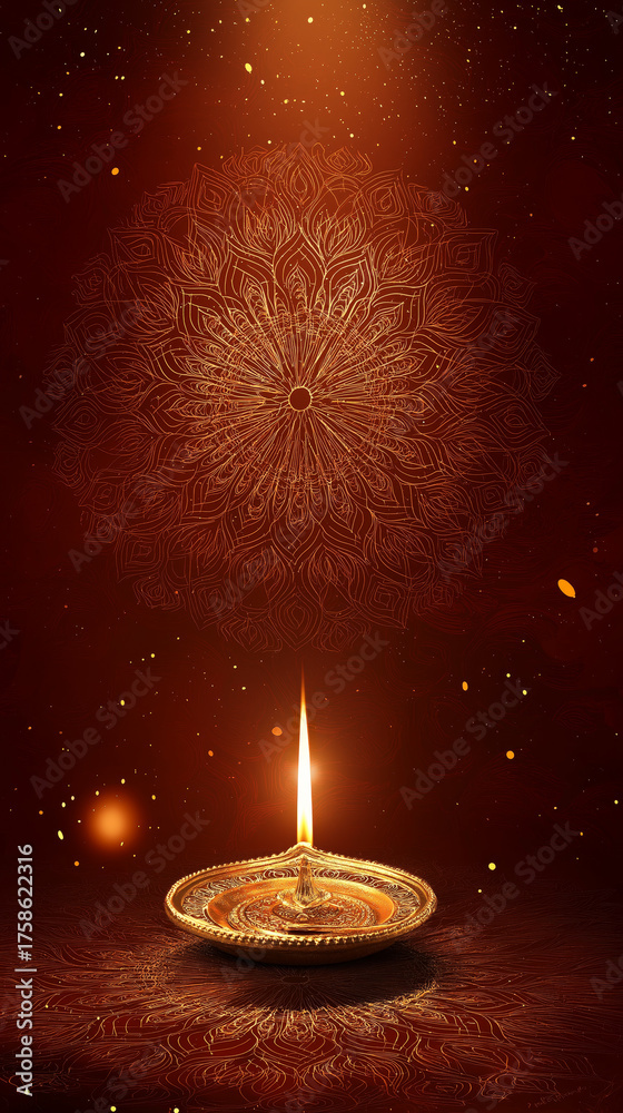 Decorative oil lamp illuminated in a warm ambiance with intricate designs and floating particles #1758622316