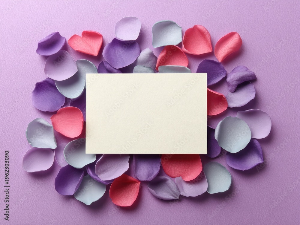 Delicate Flower Petals Surrounding Blank Card on Soft Purple Background for Creative and Romantic Themes #1962303090