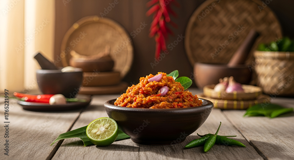 Delicious thai chili paste with lime and spices on a wooden table with decorations #1765221997