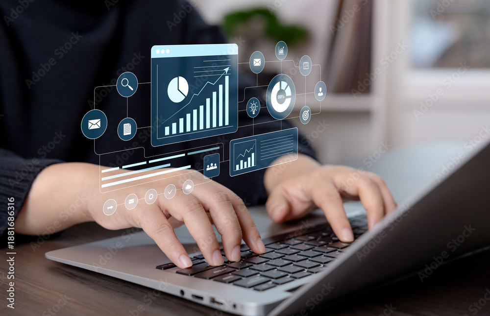 Digital business analytics interface with data visualization and performance metrics. Strategic insights, reporting, and data driven decision support for enterprise management and growth. #1881686316