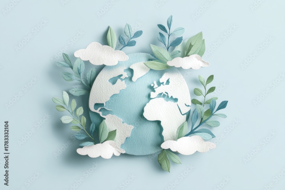 digital painting of earth made of paper layers surrounded by leaves, soft light, minimalist sustainability poster design #1783332104