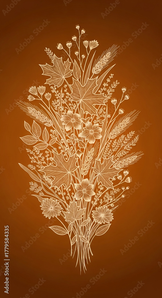 Drawing of floral composition with flower, leaf, wheat on brown background, evoking autumnal mood, symbolic of harvest, Thanksgiving and natural theme #1779584335