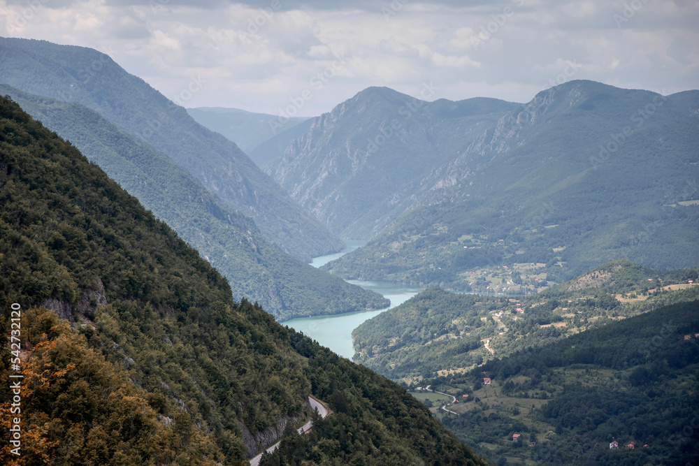 Drina River, border river between Bosnia and Herzegovina (right) and Serbia, viewed from Tara Mountain #542732120