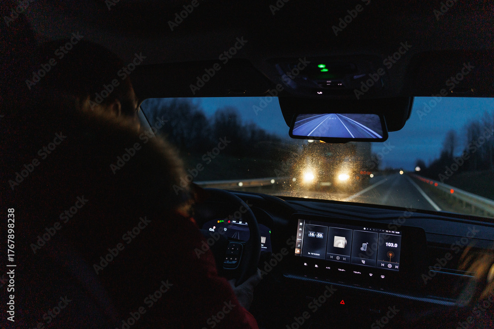 driver navigating rainy city roads, night journey with illuminated dashboard and tense urban #1767898238