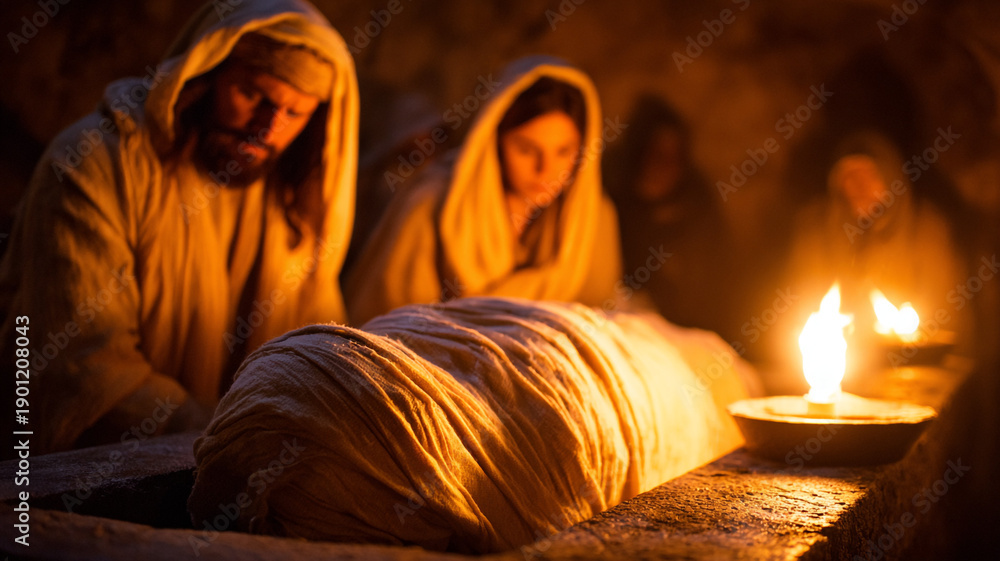 Easter Bible concept. The body of Jesus Christ in a white shroud in a cave. The Apostles and the body of Christ. #1901208043