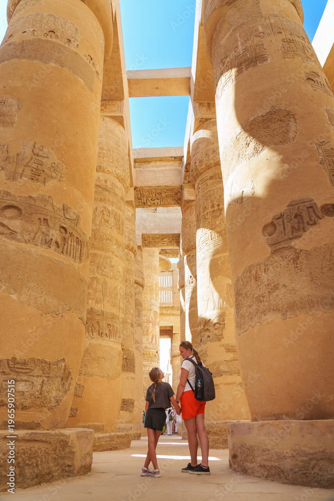 Egypt - karnak hypostyle hall columns in the temple at luxor thebes and happy tourist girls - mother and daughter on vacation. #1965907515