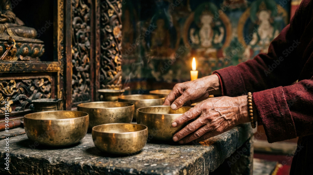 Elderly monk hands touching brass singing bowl on ancient altar with candlelight in temple #1949115731