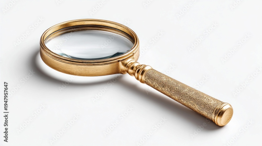 Elegant antique brass magnifying glass with textured handle on a clean white background #1947957647