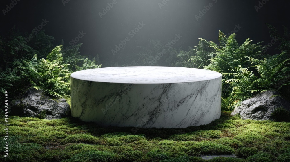 Elegant marble pedestal surrounded by lush green ferns and moss in a mystical forest setting #1956249768