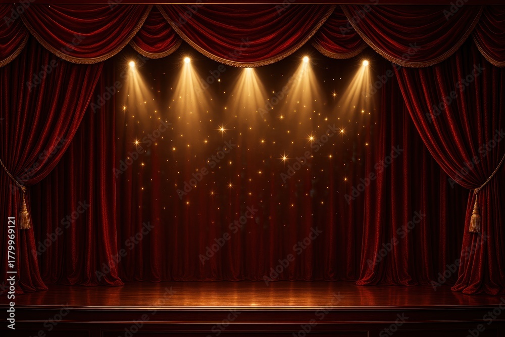 Elegant red and gold ceremonial stage backdrop with sparkling lights and luxurious fabric drapes creating prestigious award ceremony atmosphere for special events and celebrations #1779969121