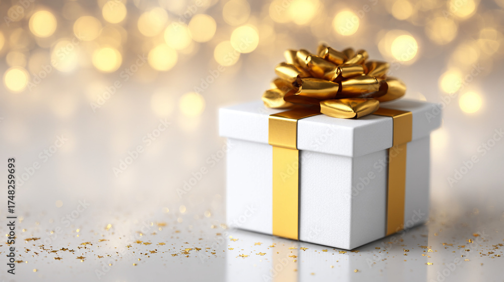 elegant white gift box with golden ribbon on reflective surface, glowing soft background, delicate golden sparkles in the air, cinematic premium TV look, "Holiday SALE" #1748259693