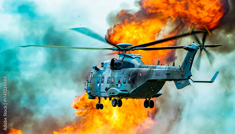 Emergency rescue helicopter mission. Firefighter response to fire and disaster. Urgent danger concept. #1747224688