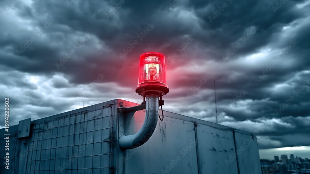 emergency warning siren light flashing red on industrial building rooftop storm clouds cinematic wide angle #1974220302