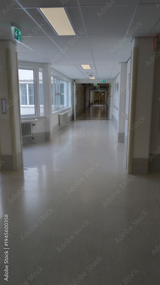 Empty Hospital Corridor With Natural Light, Clean Linoleum Floor and Illuminated Exit Signs #1945600358