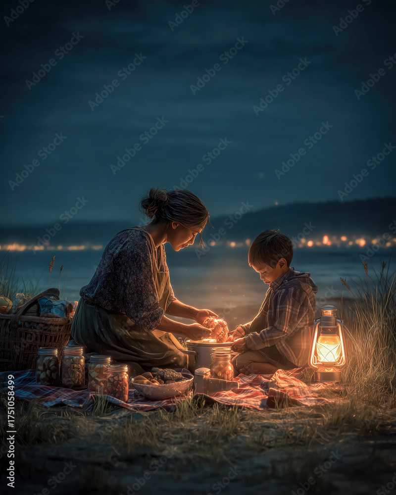 Evening picnic by the lakeside with mother and child under a starry sky #1751058499