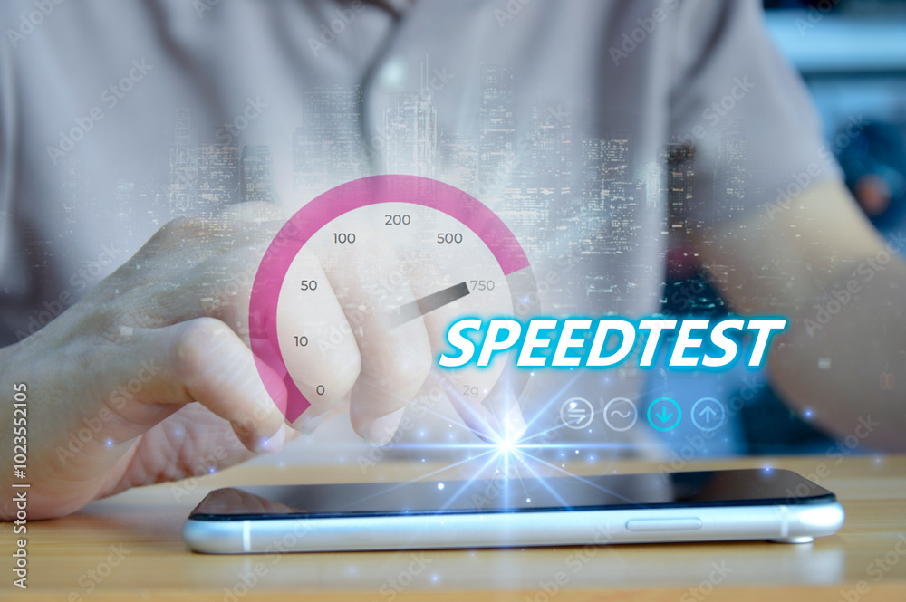 fast internet connection speedtest network bandwidth technology Man using high speed internet with smartphone and laptop computer. 5G quality, speed optimization.. #1023552105