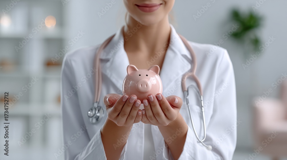 Female doctor in white coat holding pink piggy bank for healthcare savings and financial planning concept #1734752712