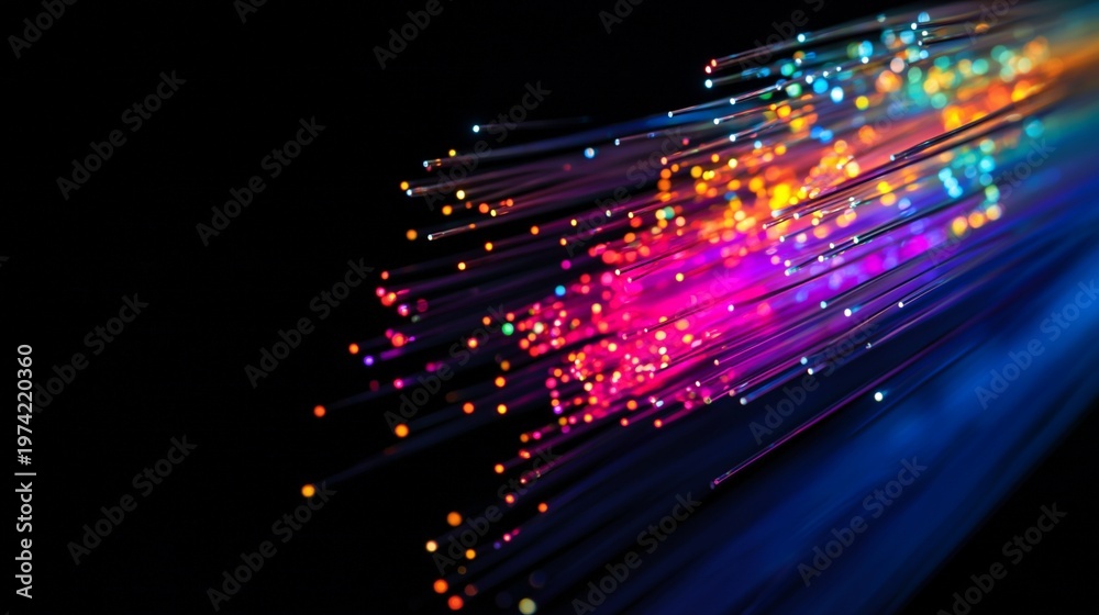 fiber optic signal cables glowing neon light abstract technology background dark environment ultra sharp macro #1974220360