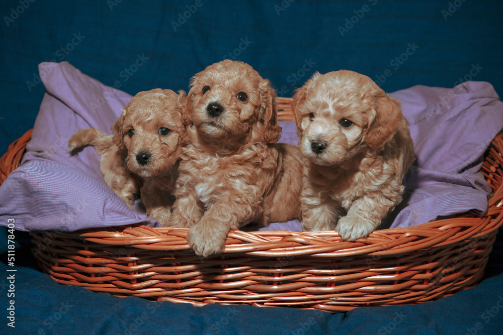 Five-week-old Poochon puppies posing in a basket #511878403