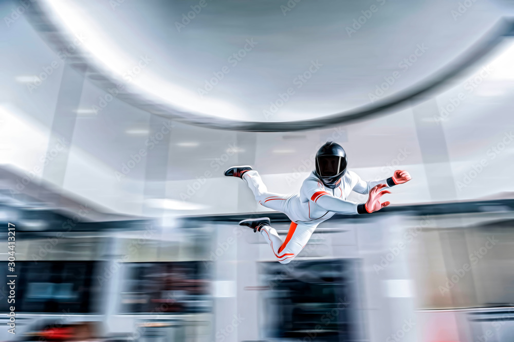 Fly Men. Levitation in wind tunnel. Indoor sky diving. Team flyers. Yoga fly in wind tunnel. Indoor skydiving. #304413217
