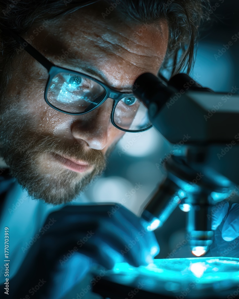 Focused scientist using microscope with blue light for advanced biological research. #1770703919