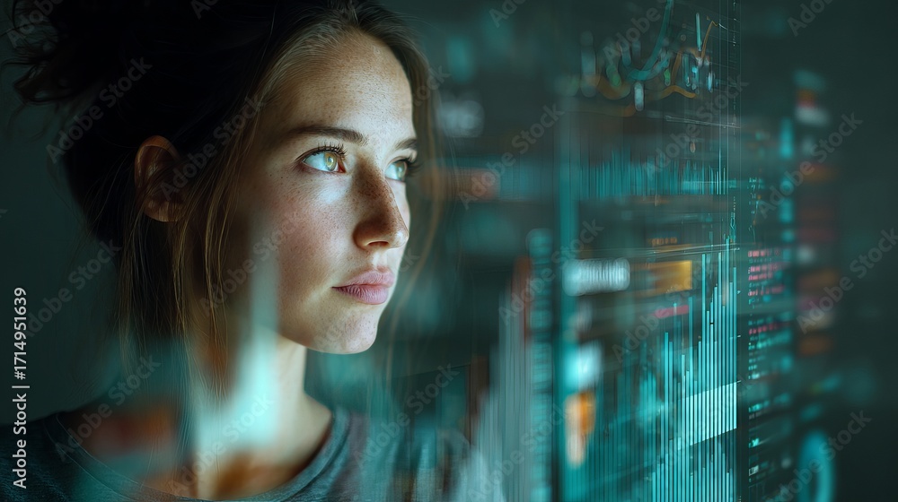 Focused woman analyzing complex data streams and financial charts on futuristic digital interface #1714951639