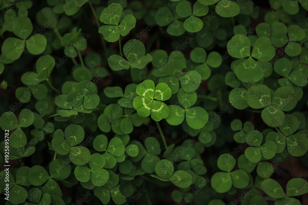 Found a good luck four leaf clover standing out from meadow of green clovers. Unique discovery of a rare 4 leaf clover for St Patricks day charm or to symbolize luck, good fortune, or prosperity. #1925895782