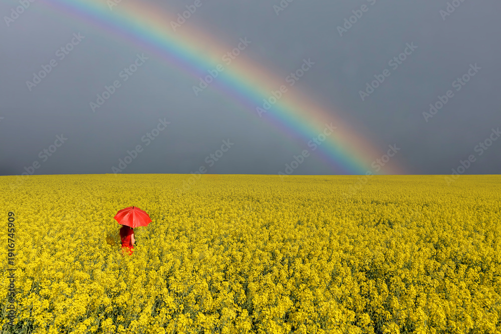 Frau mit rotem Schirm im Rapsfeld Regenbogen #1916745909