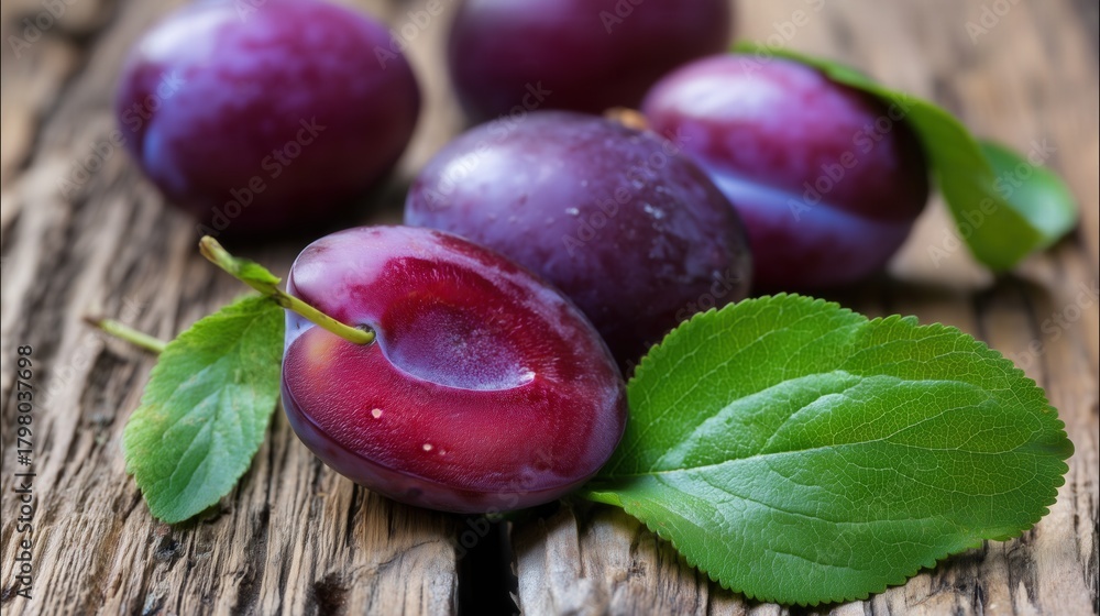 Fresh ripe plums with green leaves on rustic wood. Generative AI #1798037698