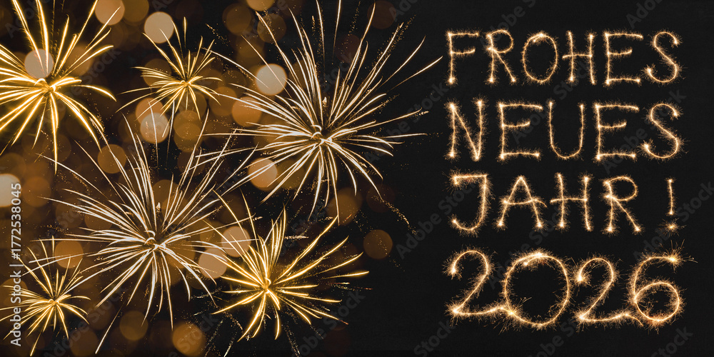 Frohes neues Jahr 2026 Grußkarte, Silvester Karte mit deutschem Text - Goldenes Feuerwerk, isoliert auf schwarzem Hintergrund #1772538045