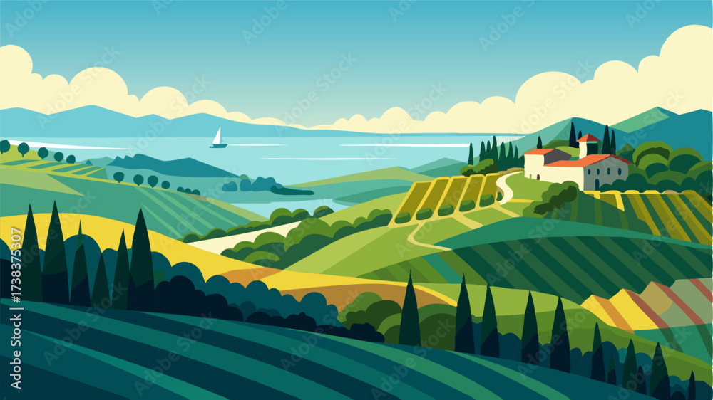 From atop the rolling Mediterranean hills one can see the vast expanse of vineyards that stretch out towards the sparkling sea. #1738375307