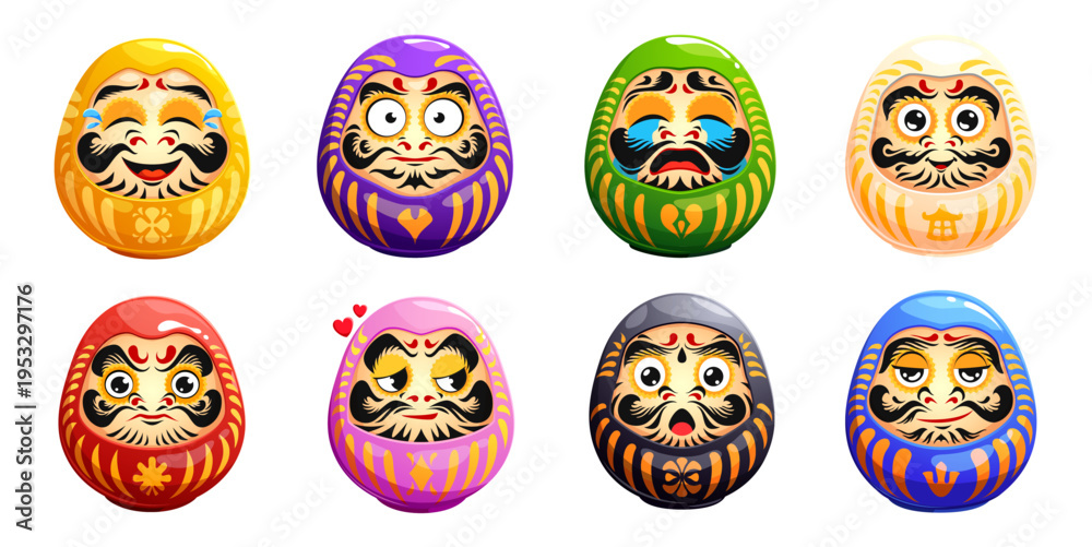 Funny japanese daruma dolls, traditional art of Japan, vector mascots of luck and success. Cartoon round color dolls with funny faces and emotions. Japanese daruma toys, Bodhidharma wishing charms set #1953297176