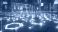Futuristic illuminated hexagonal floor in urban setting with vibrant blue lights #1031430104