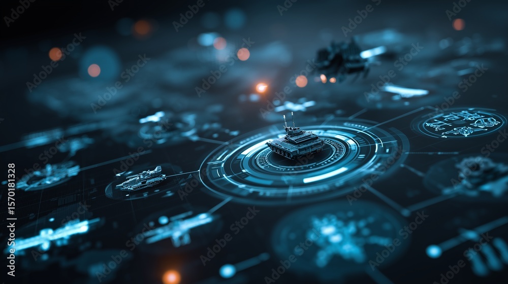 Futuristic military command interface with glowing digital icons of missiles, drones, radar, and armored vehicles on a dark tech background #1570181328