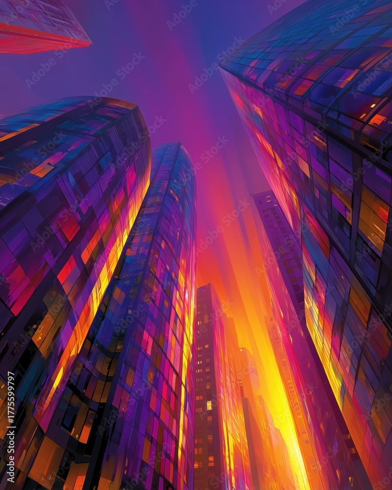 Futuristic skyscrapers glowing in sunset neon sky in dramatic cyberpunk cityscape.#1775599797