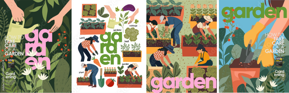 Garden, horticulture and vegetable gardening. Vector illustration of gardener hands with watering can, people work on beds for poster, background or cover #1148665354