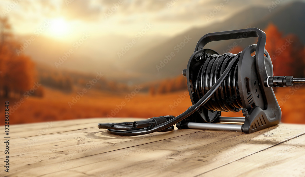 Garden hose on rustic wooden table with blurred autumn background of warm colors. Seasonal gardening, maintenance, rural lifestyle, fall clean-up and outdoor yard work concept. #1723809840