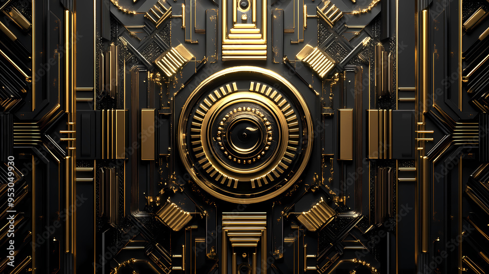 Generative ai, black and golden luxury 3d textured background in art deco style. Symmetrical. Illustration #953049930