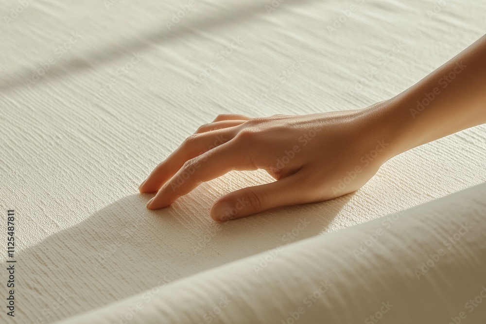 Gentle touch of human hand on textured surface in soft light #1125487811