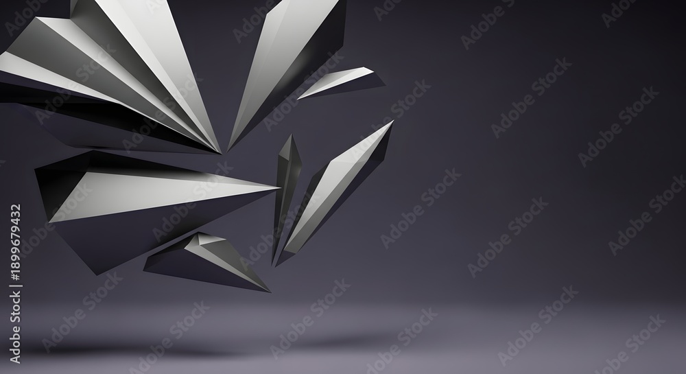 Geometric shapes in mid-air explosion, abstract 3D rendering, studio setting, dynamic viewpoint, fragmented forms #1899679432