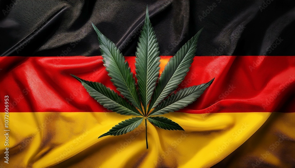 german flag colors painted on crumpled fabric with a large cannabis leaf placed on top #1072606953