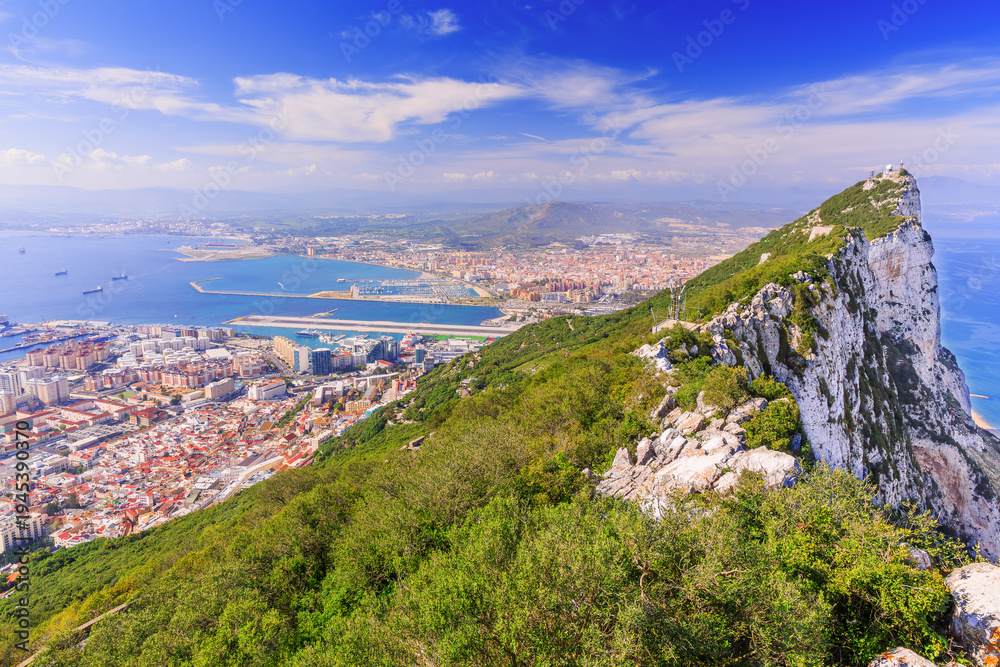 Gibraltar Rock, Gibraltar. View from above, on the left Gibraltar town and bay, La Linea town in Spain at the far end. #1945390370